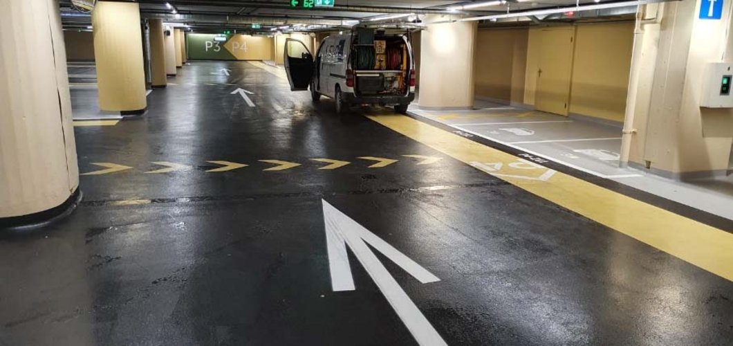 Somit konnten wir die Arbeiten um 20 Uhr beginnen. Mit Hilfe unseres Kleinspüler (3,5t) konnten wir das Parkhaus mit Wasserhochdruck waschen. Ohne Autoverkehr geht das schnell und effizient.